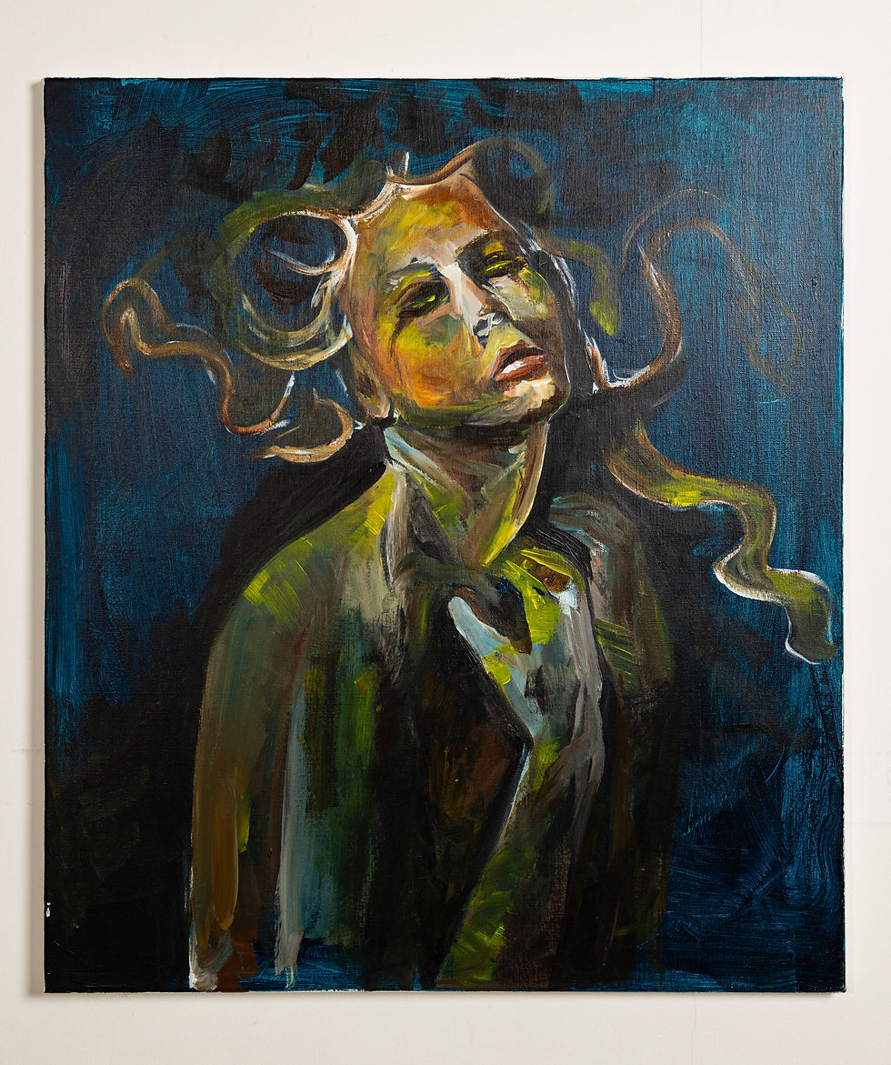 Dit schilderij toont een figuur gevangen in een moment van transformatie, waarin haar emoties haar lichaam langzaam doen overgaan in een natuurachtig, bijna plantaardig standbeeld. Haar innerlijke wereld wortelt zich naar buiten, waardoor ze tegelijk versteent en tot leven komt als een symbool van kwetsbaarheid en kracht.